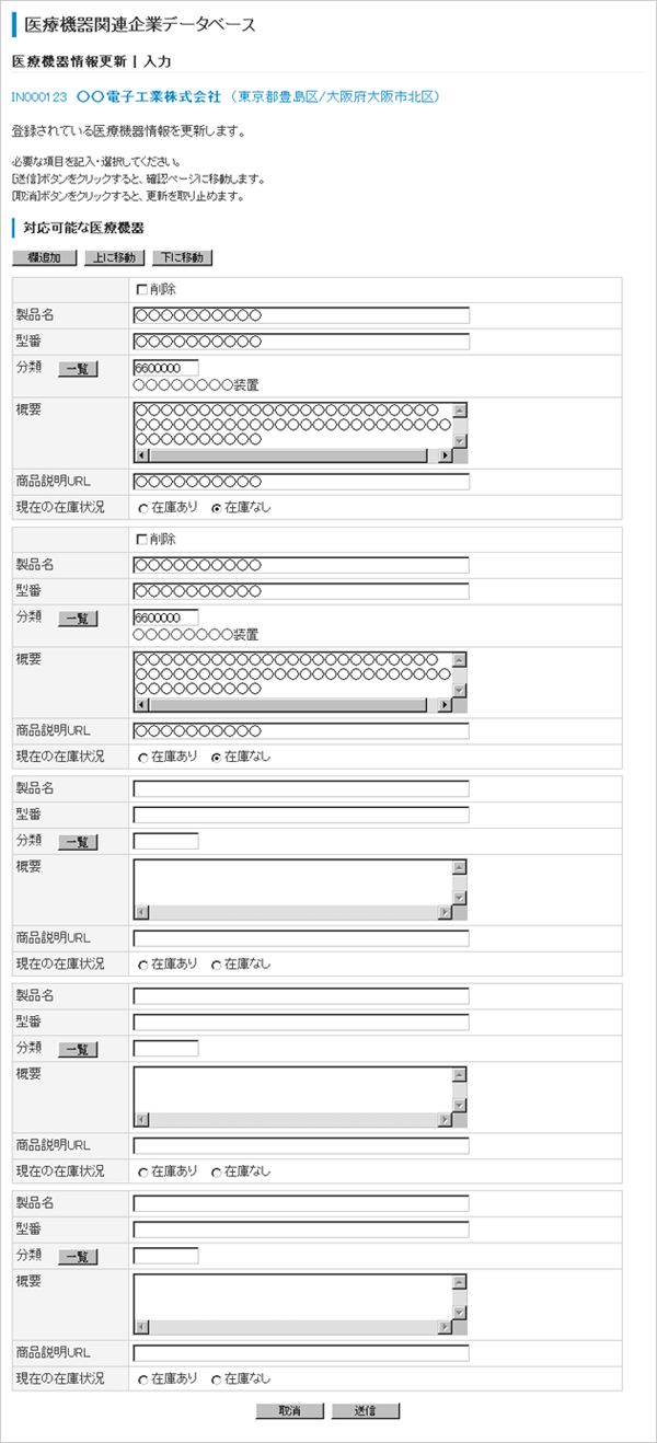メニューページで[医療機器情報更新]をクリックすると,医療機器情報更新入力ページが開きますので,そこで医療機器についての情報を入力してください.