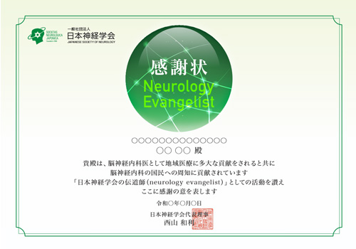 さて、脳神経内科の国民への貢献をさらに浸透させるため、本年も以下の要件を満たす開業医の皆様に表彰状を授与する運びとなりました。該当される先生は是非お申し込みください。